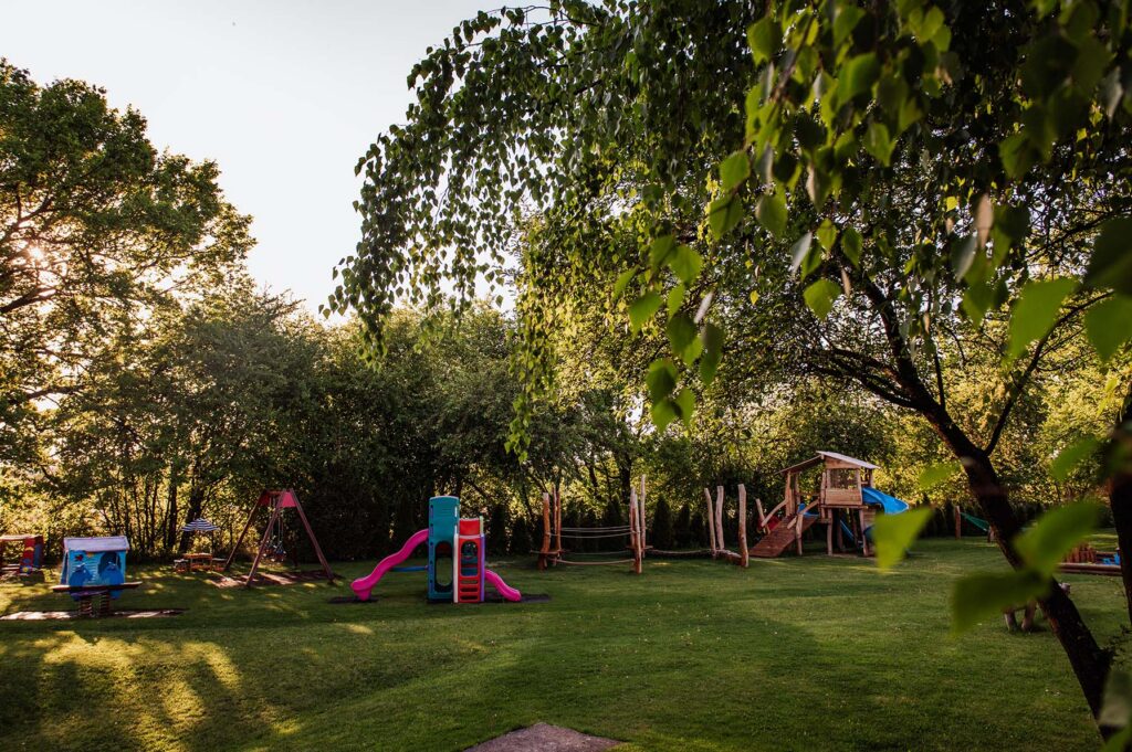 - Bliskość natury każdego dnia – zamiast betonowych placów zabaw mamy rozległą zieloną przestrzeń ze starymi drzewami, trawą, pagórkami i naturalnym terenem. Dzieci harcują na drewnianych konstrukcjach, bawią się w dużej piaskownicy, biegają i eksplorują wśród krzewów – autentyczna zabawa na świeżym powietrzu, którą podsuwa sama przyroda.